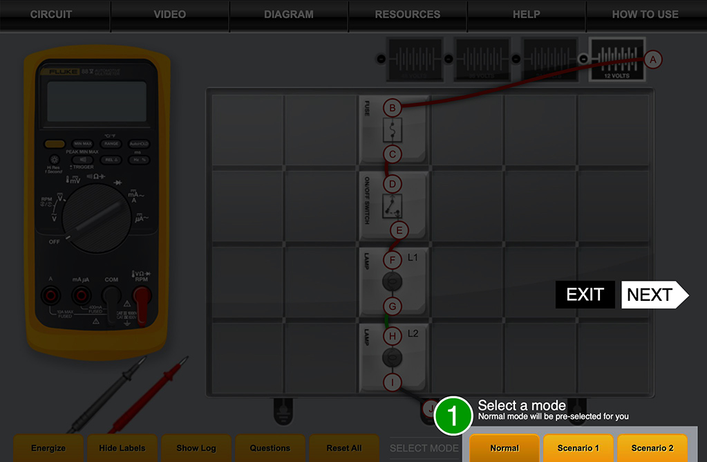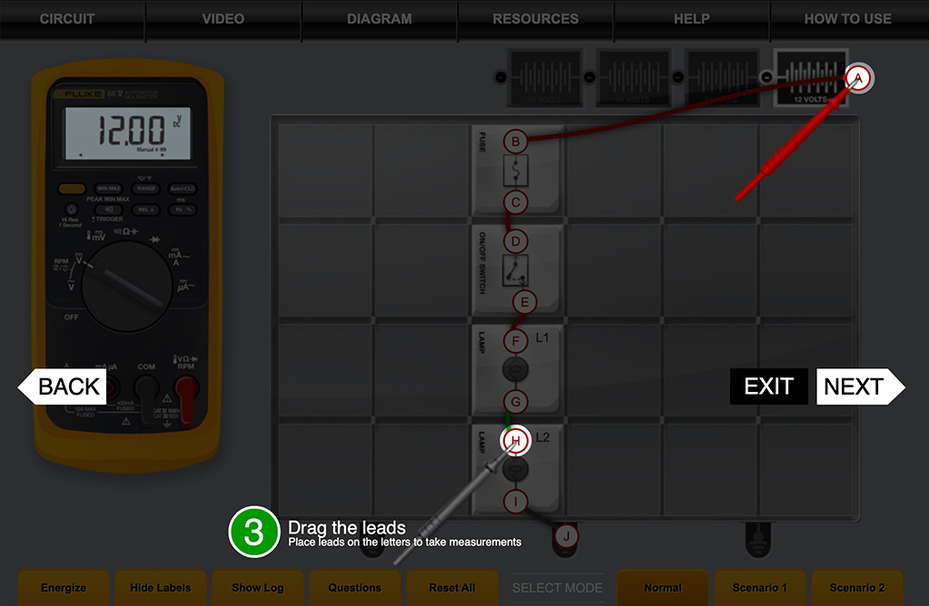 To perform a measurement, click and drag the leads from point to point. Or, click a lead to activate it, then click the letter of the terminal you want to test. While activated, the lead will snap to any contact point you select.