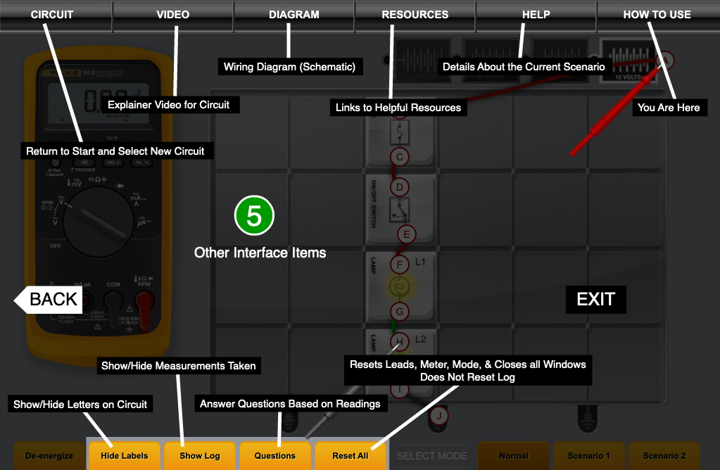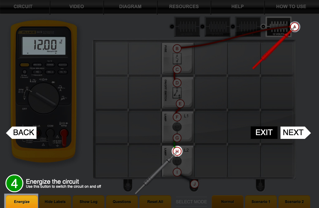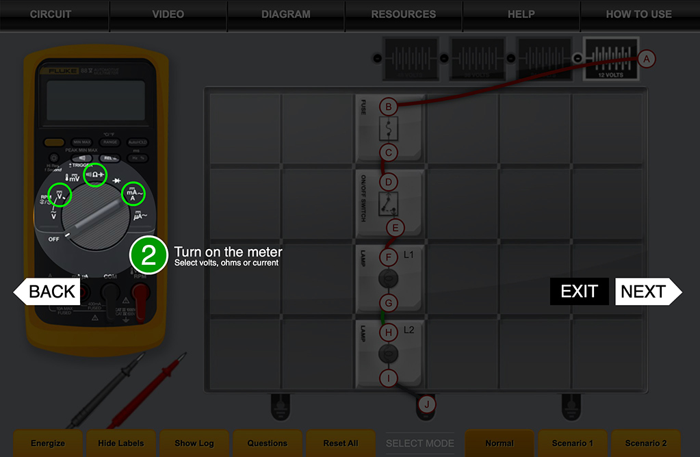 By selecting the appropriate setting on the DMM, you will be able to test for voltage, resistance, and amperage at various points within the circuits.