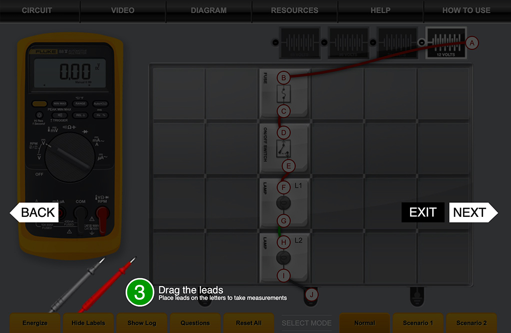 To perform a measurement, click and drag the leads from point to point. Or, click a lead to activate it, then click the letter of the terminal you want to test. While activated, the lead will snap to any contact point you select.