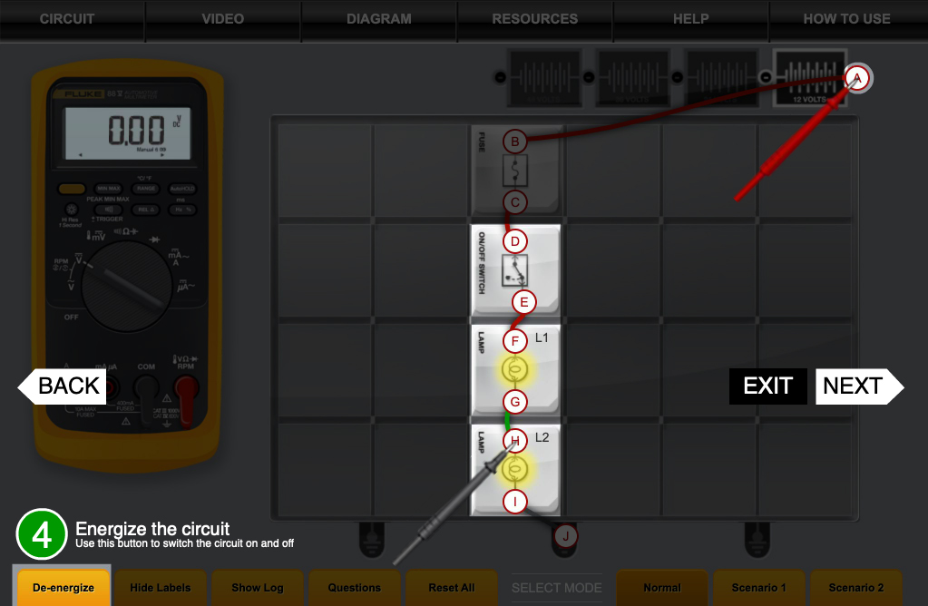 By selecting the appropriate setting on the DMM, you will be able to test for voltage, resistance, and amperage at various points within the circuits.